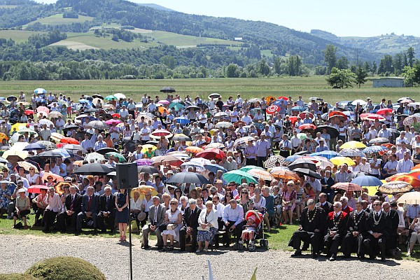 Uroczystej mszy świętej w intencji rodzin przewodniczył ordynariusz diecezji tarnowskiej biskup Andrzej Jeż. Podczas homilii wspominał wizytę Ojca Świętego Jana Pawła II w Starym Sączu oraz podkreślał jak ważną częścią Kościoła jest rodzina. „Niezwykle ważną częścią Chrystusowego Kościoła jest każda rodzina. W niej człowiek poznaje mowę, uczy się pierwszych słów, doświadcza pierwszych uczuć. Zasiane przez rodziców pierwsze ziarna człowieczeństwa mogą później przybierać kształt zdolnego do wydawania owoców drzewa lub, co niestety także pokazuje praktyka, chwastów. (…) Rodzina według zamysłu Bożego jest miejscem świętym i uświęcającym. Rodzina, jak mówi Ojciec Święty Benedykt XVI, jest dobrem dla narodu, nieodzownym fundamentem społeczeństwa, jest wielkim skarbem małżonków na całe życie, jest niezastąpionym dobrem dla dzieci, które powinny być owocem miłości, całkowitego i ofiarnego oddania się rodziców. Na wszystkich spoczywa ogromna odpowiedzialność za głoszenie pełnej prawdy o rodzinie, opartej na małżeństwie jako domowym Kościele i sanktuarium życia – mówił biskup ordynariusz. Mocna duchowo rodzina, może oprzeć się złu i przeciwnościom niesionym przez życie. Nie można obojętnie przyglądać się narzucanym naszemu społeczeństwu trendom, które odzierają człowieka z wszelkiej godności, kuszą owocem sławy i bogactwa, a gdy się ten człowiek potknie, pobłądzi i zaplącze w sieć zła, bez miłosierdzia rzucają go na ziemię, upokarzają i depczą" - podkreślał bp Andrzej Jeż.