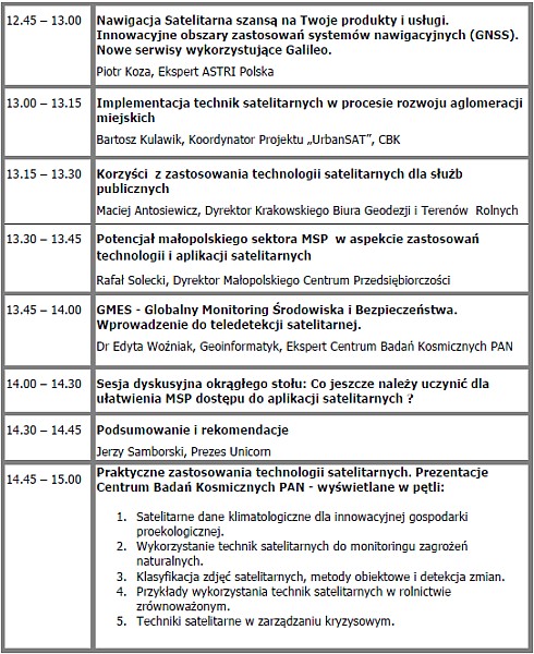 - poinformowanie przedsiębiorców o możliwościach wykorzystania w biznesie osiągnięć satelitarnych;