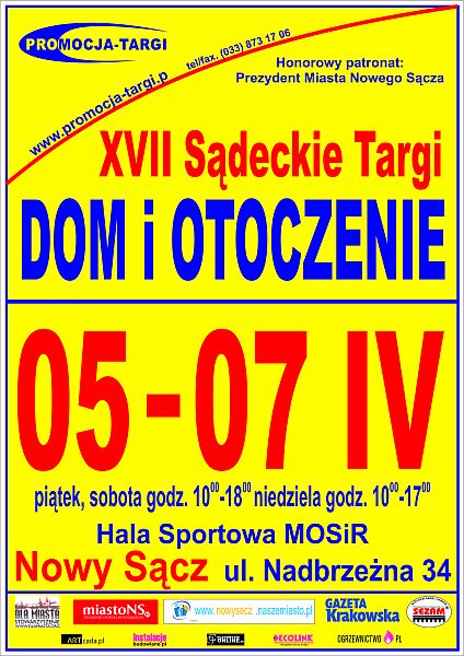 Tegoroczna edycja Targów Sądeckich odbędzie się w dniach 05-07.04.2013r., tradycyjnie na terenie Hali Sportowej MOSiR, przy ul. Nadbrzeżnej 34 w Nowym Sączu. Ofertę zaprezentują firmy z terenu Powiatu Nowosądeckiego oraz innych rejonów Polski.