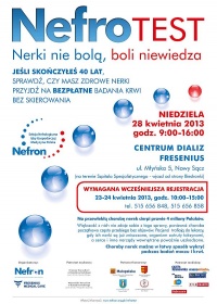 Już 28 kwietnia (niedziela) 2013 roku, w Nowym Sączu będzie można wykonać bezpłatne, proste badania krwi pod kątem chorób nerek. By wziąć udział w akcji trzeba mieć ukończone 40 lat i wcześniej się zarejestrować. Ilość miejsc na badania jest ograniczona i wynosi 400. Akcja w Nowym Sączu jest częścią ogólnopolskiej kampanii NEFROTEST, organizowanej przez Nefron Sekcję Nefrologiczną Izby Gospodarczej Medycyna Polska oraz Centrum Dializ Fresenius w Nowym Sączu. Wsparcia dla akcji na terenie całego kraju udzieliła Pani Anna Komorowska – Małżonka Prezydenta RP. Na szczeblu regionalnym badania swoim patronatem wspierają: Jerzy Miller – Wojewoda Małopolski, Marek Sowa – Marszałek Województwa Małopolskiego, Andrzej Jeż – Biskup Tarnowski, Ryszard Nowak – Prezydent Nowego Sącza, Jan Golonka – Starosta Powiatu Nowosądeckiego oraz lek. med. Artur Puszko – Dyrektor Szpitala Specjalistycznego w Nowym Sączu.