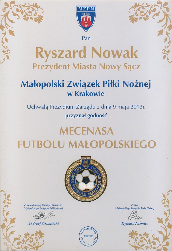 Zawodnikom gratulował prezydent Ryszard Nowak. „Jesteśmy zaszczyceni, że władze piłkarskie Małopolskiego Związku Piłki Nożnej na czele z prezesem Ryszardem Niemcem, powierzyły sądeckiemu Związkowi organizację Turnieju Finałowego o Puchar im. Jerzego Michałowicza rangi Mistrzostw Polski U-15. Dziękuję za obecność. Wszyscy jesteście zwycięzcami” – podkreślił prezydent, który podczas sobotniej uroczystości sam został wyróżniony. Małopolski Związek Piłki Nożnej w Krakowie przyznał prezydentowi godność Mecenasa Futbolu Małopolskiego. Pamiątkowy dyplom przekazali Ryszard Niemiec, prezes Małopolskiego Związki Piłki Nożnej w Krakowie oraz Antoni Ogórek, prezes Okręgowego Związku Piłki Nożnej w Nowym Sączu.