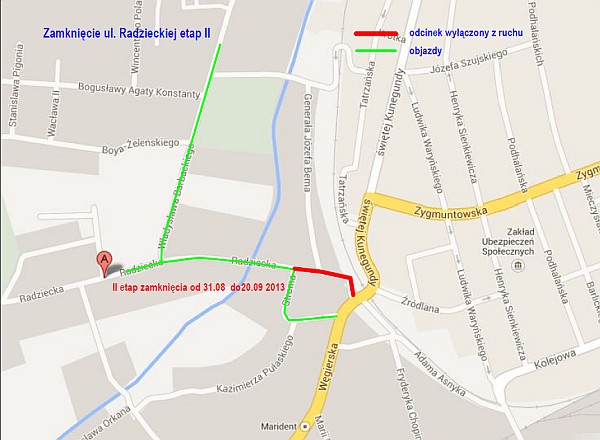 Wyłączenie z ruchu odcinka ul. Radzieckiej - od ul. Stromej do ul. Węgierskiej. Czas trwania robót – 31.08.2013 r. - 20.09.2013 r.