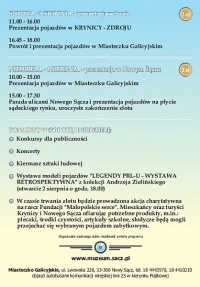 W programie imprezy przewidziana jest prezentacja w trasie – w Krynicy-Zdroju, prezentacja zabytkowych pojazdów w Miasteczku Galicyjskim, parada ulicami Nowego Sącza, prezentacja pojazdów na płycie sądeckiego Rynku oraz konkursy dla publiczności, koncerty czy kiermasz sztuki ludowej.