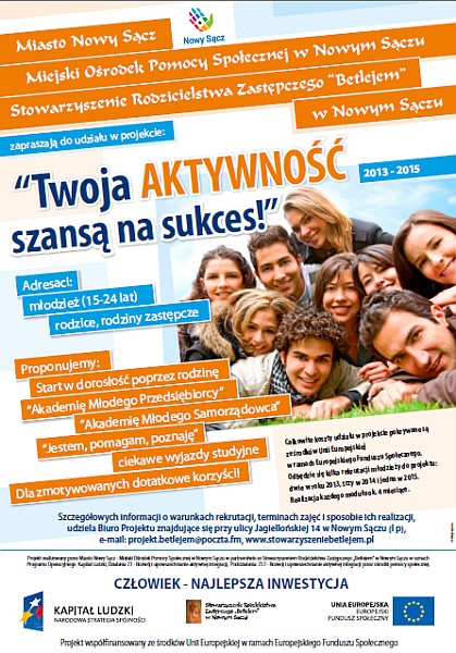 Projekt „Twoja AKTYWNOŚĆ szansą na sukces!” realizowany jest przez Stowarzyszenie Rodzicielstwa Zastępczego „Betlejem” w partnerstwie z Miejskim Ośrodkiem Pomocy Społecznej w Nowym Sączu.