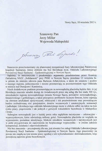 Burmistrzowie, wójtowie, starostwie oraz radni wojewódzcy z regionu sądeckiego, limanowskiego i gorlickiego poparli list skierowany do wojewody małopolskiego Jerzego Millera, przeciwko planowanej reorganizacji bazy laboratoryjnej Państwowej Inspekcji Sanitarnej, której efektem ma być likwidacja m.in. Oddziału Laboratoryjnego Powiatowej Stacji Sanitarno–Epidemiologicznej w Nowym Sączu. List do wojewody wystosowały władze miasta Nowego Sącza, do których to o interwencję zwrócił się w imieniu pracowników sądeckiego oddziału, kierownik Krzysztof Dziedzina.