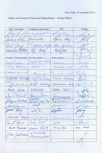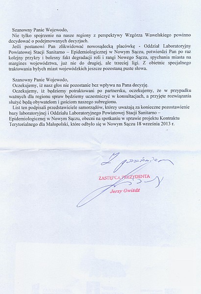 List podpisali przedstawiciele samorządów uczestniczących 18 września 2013 r. w spotkaniu w Nowym Sączu nt. projektu Kontraktu Terytorialnego dla Małopolski oraz radni wojewódzcy Marta Mordarska, Grzegorz Biedroń i Paweł Śliwa. Samorządowcy wyrazili nadzieję, że będą potraktowani po partnersku i oczekują, że w przypadku ważnych dla regionu spraw będą uczestniczyć w konsultacjach, a przyjęte rozwiązania służyć będą obywatelom i gościom naszego subregionu. „Nie tylko spojrzenie na nasze regiony z perspektywy Wzgórza Wawelskiego powinno decydować o podejmowanych decyzjach. Jeśli postanowi Pan zlikwidować nowosądecką placówkę - Oddział Laboratoryjny Powiatowej Stacji Sanitarno–Epidemiologicznej w Nowym Sączu, potwierdzi Pan po raz kolejny przykry i bolesny fakt degradacji roli i rangi Nowego Sącza, spychania miasta na margines województwa, już nie do drugiej, ale trzeciej ligi. Z obietnic specjalnego traktowania byłych miast wojewódzkich pozostaną puste słowa” - zakończył list wiceprezydent Jerzy Gwiżdż.
