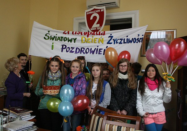 Z uśmiechem, radością, kwiatami i słodyczami w sądeckich instytucjach, również w Urzędzie Miasta, gościli uczniowie z Gimnazjum nr 2 im. Ks. Jana Twardowskiego. Okazją był przypadający dzisiaj Światowy Dzień Życzliwości i Pozdrowień. „Wzajemny szacunek i życzliwość przynoszą natychmiastowe rezultaty. Wysyłajmy więc do siebie życzenia, pomagajmy sobie, dziękujmy nawet za drobiazgi, uśmiechajmy się do siebie w domu, w szkole, w autobusie czy na ulicy. Nie tylko od święta” - podkreślali gimnazjaliści wręczając karteczki z aforyzmami, kwiaty i słodycze.
