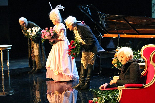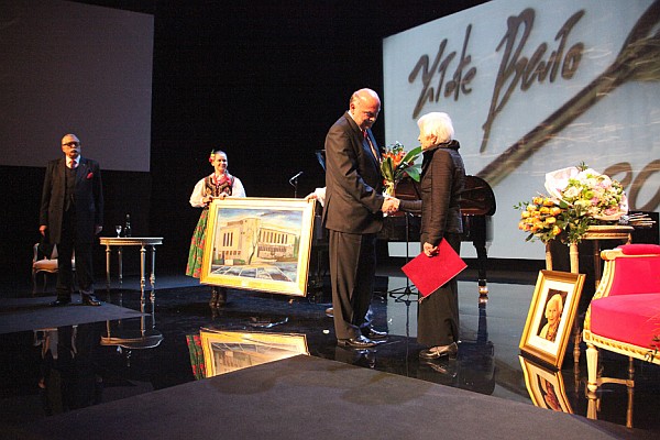 Bohaterka wieczoru mimo sędziwego wieku (w lutym przyszłego roku kończy 99 lat!) błyszczała na scenie, dzielnie dzierżąc berło zaprojektowane przez prof. Krzysztofa Nitscha. Tryskała humorem, a jak przystało na monarchinię przemawiała do widzów w liczbie mnogiej. Przywołała wspomnienia związane z patronem nowosądeckiego teatru i swoim pierwszym spotkaniem ze sceną: