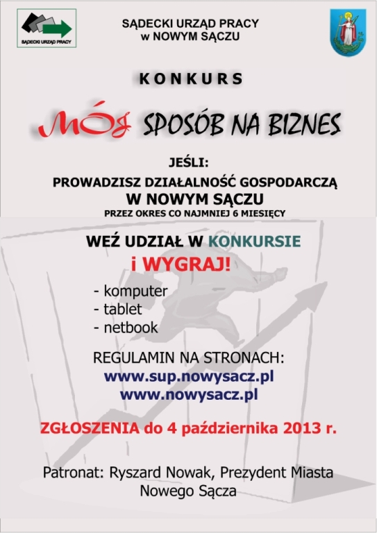 Jeśli prowadzisz działalność gospodarczą na terenie miasta Nowego Sącza przez minimum sześć miesięcy, ten konkurs jest dla Ciebie. Opowiedz o swoim pomyśle na własną firmę i wygraj jedną z nagród. Udział w konkursie gwarantuje także promocję Twojego biznesu.