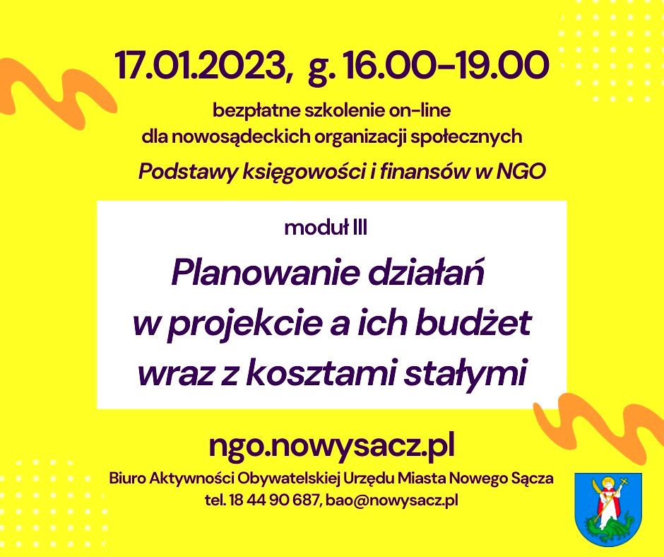 Szkolenie jest trzecim z 12 zaplanowanych w okresie 11.2022 - 04.2023 modułów w cyklu: „Podstawy księgowości i finansów dla NGO” i ma na celu pomoc w zaznajomieniu się, uporządkowaniu wiedzy i rozwinięciu umiejętności, w zakresie (zwykle niecieszących się sympatią) zagadnień finansowo-księgowych w zarządzaniu organizacjami.