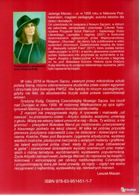 "W 2016 roku w Nowym Sączu, zwanym przez miłośników sztuki polską Sienną, mocno zdenerwowana studentka zdała ostatni egzamin i otrzymała tytuł licencjata PWSZ. Nie byłoby to niczym szczególnym, gdyby nie fakt, że absolwentka liczyła sobie prawie osiemdziesiąt wiosen (…). ” – pisze Leszek Mazan, który w słowie polecającym czytelnikom lekturę książki, nazywa jej główną bohaterkę "Ostatnią Czarodziejką Nowego Sącza", a opowieść Jadwigi Marzec "kolorową i wzruszającą jak obrazy naddunajeckiej Czarodziejki, przypominającą starą jak świat prawdę, że nigdy – nigdy! nie wolno rezygnować z najbardziej, wydawałoby się, nierealnych marzeń."