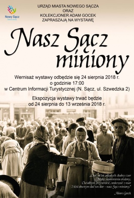 Urząd Miasta Nowego Sącza oraz kolekcjoner Adam Gocek zapraszają na wystawę starych fotografii związanych z naszym miastem. Wernisaż wystawy pt. „Nowy Sącz miniony…” odbędzie się 24 sierpnia (piątek) o godz. 17.00. w Centrum Informacji Turystycznej przy ul. Szwedzkiej 2.