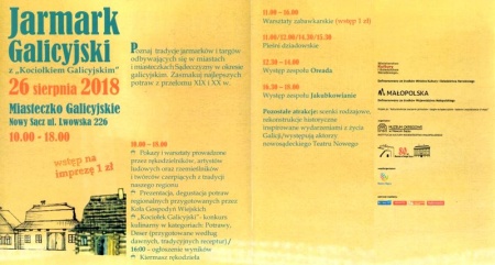 Muzeum Okręgowe w Nowym Sączu zaprasza w niedzielę, 26 sierpnia, w godz. od 10.00 do 18.00, na imprezę plenerową „Jarmark Galicyjski” do Miasteczka Galicyjskiego. Będzie okazja do poznania tradycji jarmarków i targów odbywających się w miastach i miasteczkach Sądecczyzny w okresie galicyjskim. Nie zabraknie również najlepszych potraw z przełomu XIX i XX w.