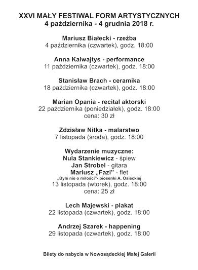 - Mały Festiwal Form Artystycznych jest najważniejszą imprezą organizowaną przez Małą Galerię od 1993 roku, przeglądem dokonań w sztuce współczesnej – mówi dyrektor Nowosądeckiej Małej Galerii Alicja Hebda. – Na program kolejnych edycji składają się wystawy plastyczne, a także imprezy obrazujące dokonania w innych dziedzinach sztuki, w formie wieczorów poezji, koncertów, spektakli teatralnych, recitali, happeningów, performance, spotkań autorskich. W czasie trwania Festiwalu Nowy Sącz staje się prawdziwym centrum kultury polskiej, a mieszkańcy miasta maja okazję obcowania ze sztuką i jej wybitnymi twórcami.
