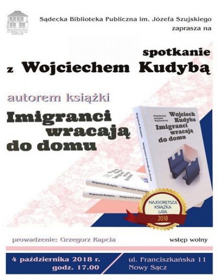 Prof. dr hab. Wojciech Kudyba w Sądeckiej Bibliotece Publicznej opowie o swojej najnowszej książce pod tytułem "Imigranci wracają do domu", która uzyskała tytuł "Najgorętszej książki lata 2018" w głosowaniu widzów TVP Kultura. Spotkanie odbędzie się w bibliotece przy ulicy Franciszkańskiej 11 we czwartek 4 października o godzinie 17:00, a poprowadzi je Grzegorz Rapcia.