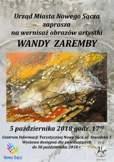 Urząd Miasta Nowego Sącza zaprasza na wystawę malarstwa Wandy Zaremby. Wernisaż odbędzie się 5 października (piątek) 2018 r., o godz. 17.00 w Centrum Informacji Turystycznej przy ul. Szwedzkiej 2 w Nowym Sączu. Wystawę będzie można oglądać do 31 października 2018 r.