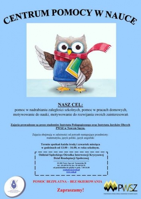 Sądecki Ośrodek Interwencji Kryzysowej organizuje Centrum Pomocy w Nauce dla dzieci i młodzieży ze szkół podstawowych, którzy potrzebują pomocy lub chcą rozwijać swoje zainteresowania w zakresie matematyki, języka polskiego lub języka angielskiego.