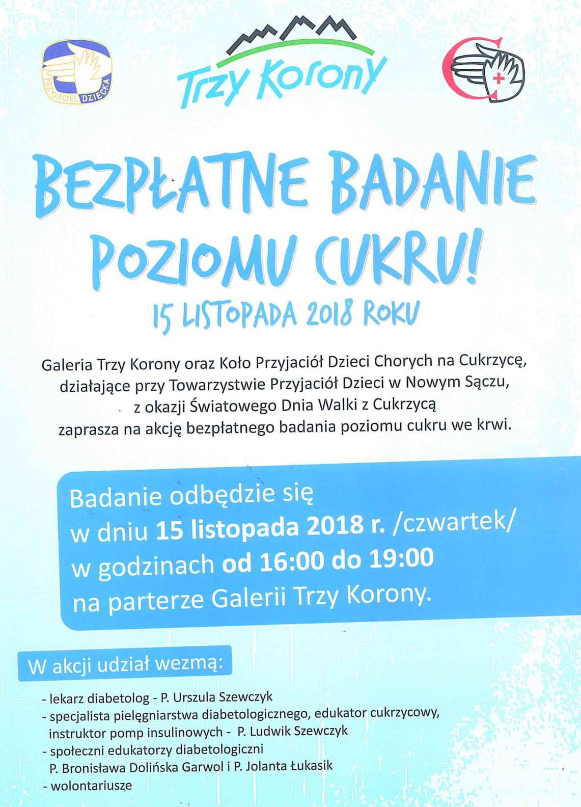 - Badanie odbędzie się w Galerii Trzy Korony (na parterze) w dniu 15 listopada 2018 r. (czwartek), w godz. od 16.00 do 19.00. Serdecznie zapraszamy do udziału - informuje Przewodnicząca Koła Przyjaciół Dzieci Chorych na Cukrzycę, Bronisława Garwol.