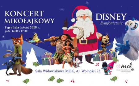 Sądecka Orkiestra Symfoniczna pod batutą Leszka Mieczkowskiego przygotowała z okazji dnia świętego Mikołaja koncert, którzy przeniesie słuchaczy w świat bajek Disneya. Orkiestra zagra w Miejskim Ośrodku Kultury 8 grudnia dwa koncerty – o godzinie 14:00 i 17:00.