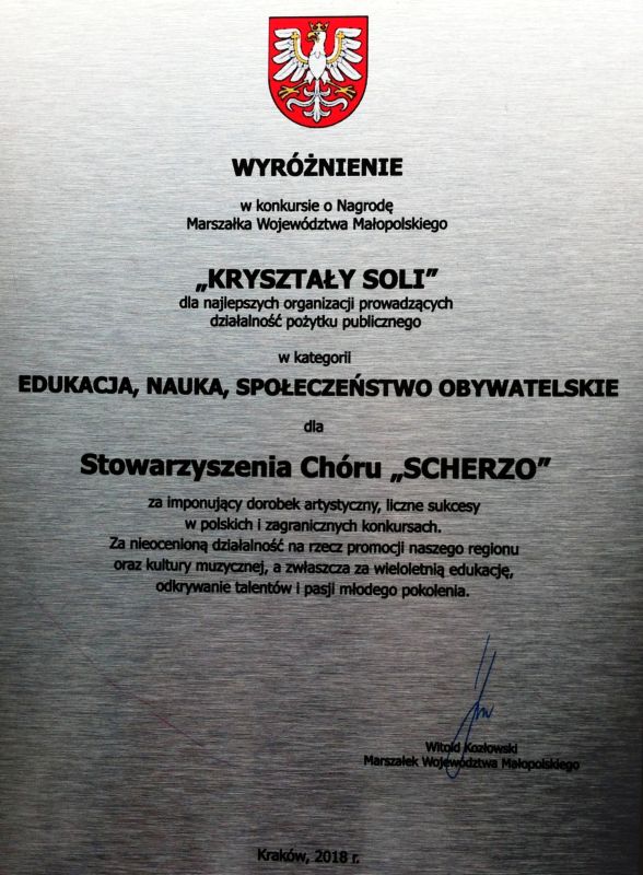 Chór Scherzo, działający przy I Liceum Ogólnokształcącym im. Jana Długosza w Nowym Sączu, wyróżniony został nagrodą "Kryształy soli”, przyznawaną przez Województwo Małopolskie. Nagrodę odebrał dr Andrzej Citak, twórca oraz dyrygent chóru, podczas XXI Małopolskiego Forum Organizacji Pozarządowych w Muzeum Sztuki i Techniki Japońskiej Manggha w Krakowie. "Kryształy soli" przyznano w kategorii „Edukacja, nauka, społeczeństwo obywatelskie”.