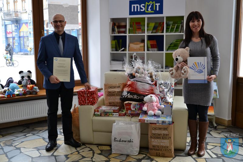 Podczas spotkania prezes fundacji Iwona Romaniak wręczyła dyrektorowi Tomaszowi Baliczkowi dyplom - podziękowania za włączenie się Urzędu Miasta Nowego Sącza w organizowane przez siebie akcje, a w zamian otrzymała pluszowego misia z prośbą o oddanie go dzieciom z lwowskiego sierocińca.
