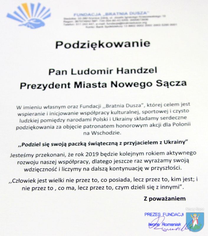 Całe mnóstwo darów po raz kolejny trafiło do naszych rodaków we Lwowie oraz dzieci z lwowskich sierocińców, dzięki akcji charytatywnej zorganizowanej przez Fundację Bratnia Dusza, pn. „Podziel się swoją paczką świąteczną z przyjacielem z Ukrainy”. W Centrum Informacji Turystycznej - podczas spotkania z sądeckimi mediami - organizatorzy podsumowali przebieg ostatniego wyjazdu do Lwowa. Patronat Honorowy nad akcją sprawował Prezydent Nowego Sącza Ludomir Handzel.