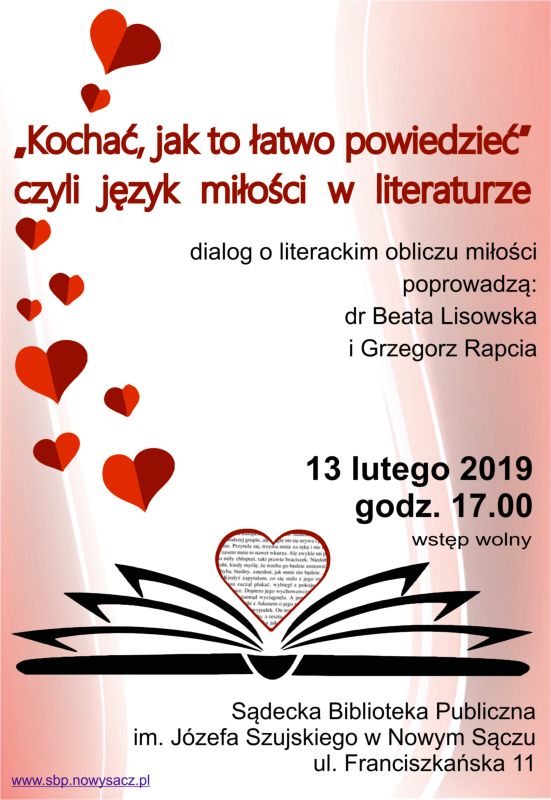 Sądecka Biblioteka Publiczna im. Józefa Szujskiego w Nowym Sączu zaprasza na „uczuciowo-językoznawcze” spotkanie „Kochać, jak to łatwo powiedzieć” czyli język miłości w literaturze, które poprowadzą dr. Beata Lisowska i Grzegorz Rapcia. Spotkanie odbędzie się w środę, 13 lutego, o godz. 17.00 w piwnicach SBP.