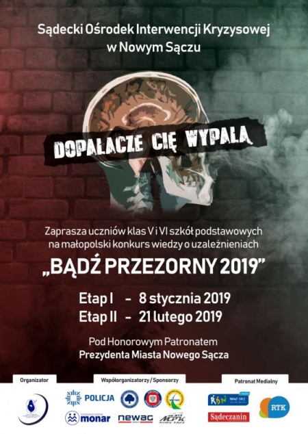 Sądecki Ośrodek Interwencji Kryzysowej, przy udziale Urzędu Miasta Nowego Sącza, organizuje V edycję Małopolskiego konkursu wiedzy o uzależnieniach - BĄDŹ PRZEZORNY 2019 pod hasłem "Dopalacze Cię wypalą". Patronat Honorowy nad konkursem sprawuje Prezydent Miasta Nowego Sącza Ludomir Handzel.