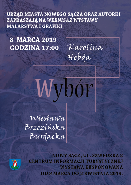 Urząd Miasta Nowego Sącza oraz Autorki wystawy: Karolina Hebda i Wiesława Brzezińska-Burdacka zapraszają na wernisaż wystawy malarstwa i grafiki pt. „Wybór”, w dniu 8 marca (piątek) o godz. 17.00 w Centrum Informacji Turystycznej, ul. Szwedzkiej 2 w Nowym Sączu.