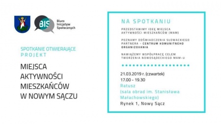 Urząd Miasta Nowego Sącza oraz Biuro Inicjatyw Społecznych zapraszają na spotkania otwierające projekt Miejsca Aktywności Mieszkańców w Nowym Sączu, które odbędą się w czwartek, 21 marca, o godz. 13.00 oraz 17.00 w sali reprezentacyjnej sądeckiego ratusza.