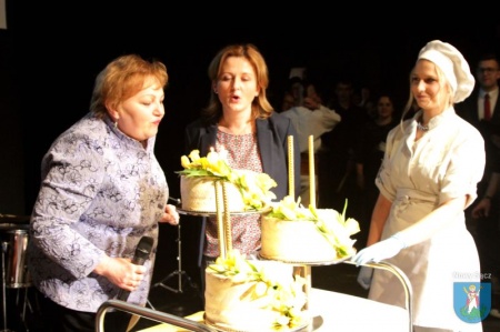 Między występami artystycznymi, na które złożyły się piosenki, tańce, występy kabaretowe a także widowiskowy pokaz barmański w wykonaniu absolwenta szkoły Krzysztofa Bajerskiego, na scenę wjechał jubileuszowy tort, na którym świeczki zdmuchnęły wiceprezydent miasta Magdalena Majka oraz dyrektor szkoły Barbara Świętoń.