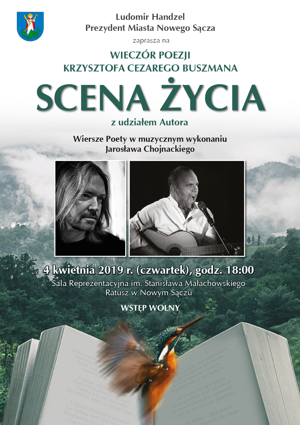 Prezydent Miasta Nowego Sącza Ludomir Handzel zaprasza na wieczór poezji Krzysztofa Cezarego Buszmana pt. „Scena życia”, z udziałem Autora. Spotkanie odbędzie się w czwartek, 4 kwietnia o godz. 18.00 w Sali Reprezentacyjnej sądeckiego ratusza. Wiersze poety zaprezentuje, w muzycznym wykonaniu, Jarosław Chojnacki.