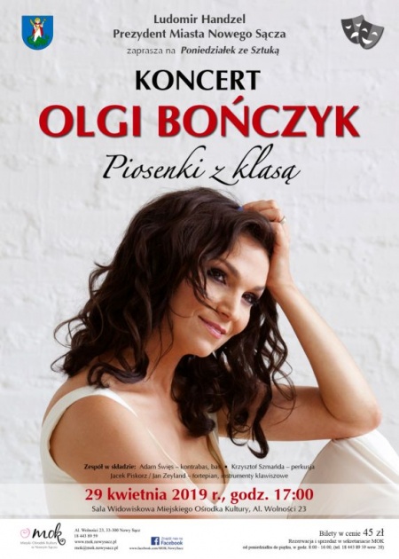 Prezydent Miasta Nowego Sącza Ludomir Handzel zaprasza na kolejne spotkanie z cyklu Poniedziałek ze Sztuką. Tym razem na scenie Miejskiego Ośrodka Kultury zaśpiewa Olga Bończyk w koncercie pod tytułem „Piosenki z klasą”. Koncert odbędzie się 29 kwietnia o godzinie 17:00.