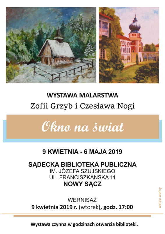 Sądecka Biblioteka Publiczna im. Józefa Szujskiego zaprasza na wernisaż wystawy malarstwa Zofii Grzyb i Czesława Nogi pt. „Okno na świat". Wernisaż odbędzie się we wtorek, 9 kwietnia, o godz. 17.00 w zabytkowych piwnicach biblioteki przy ul. Franciszkańskiej 11. Wystawa będzie czynna do 6 maja 2019 r. w godzinach otwarcia placówki.