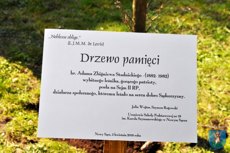 5 kwietnia, w samo południe, dzieci ze Szkoły Podstawowej nr 18 im. Karola Szymanowskiego w Nowym Sączu, ubiegający się o zdobycie młodzieżowych mandatów poselskich na XXV Sesję Sejmu Dzieci i Młodzieży, zasadziły na sądeckich Plantach drzewo poświęcone hrabiemu Adamowi Stadnickiemu.
