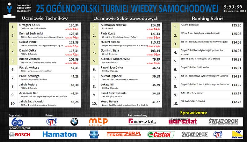 Wśród laureatów wysokie miejsce zajęli uczniowie Zespołu Szkół Samochodowych im. Tadeusza Tańskiego: Konrad Bednarski, który uplasował się na drugim miejscu i Łukasz Pyrdoł na trzecim miejscu - obaj są uczniami klasy IV Technikum Samochodowego. W turnieju wziął udział także uczeń klasy III Technikum Samochodowego Norbert Gumulak.