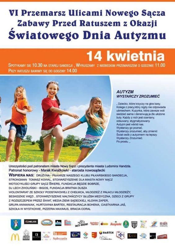 Przemarsz Ulicami Miasta Nowego Sącza z okazji Światowego Dnia Autyzmu odbędzie się 14 kwietnia. Wyruszy ze Starej Sandecji przy Alejach Wolności o godzinie 11:00 i przejdzie na płytę Rynku, gdzie do godziny 14:00 trwać będzie zabawa.