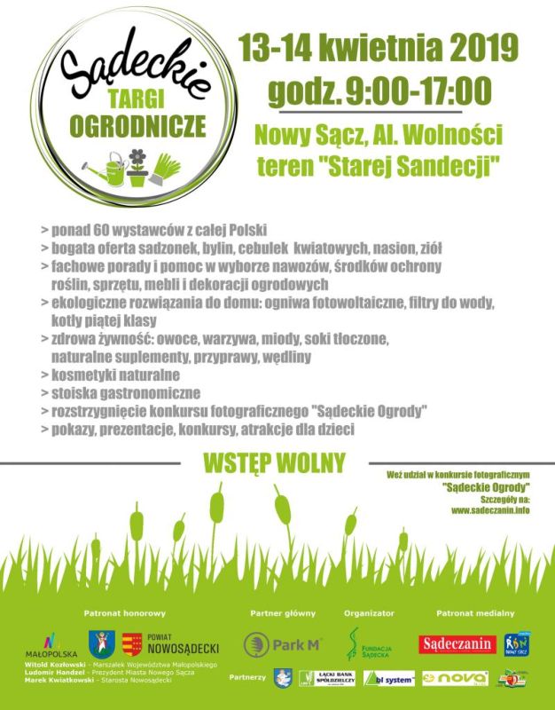 II Sądeckie Targi Ogrodnicze odbywają się pod patronatem Prezydenta Miasta Nowego Sącza Ludomira Handzla oraz Marszałka Województwa Małopolskiego Witolda Kozłowskiego i Starosty Nowosądeckiego Marka Kwiatkowskiego.