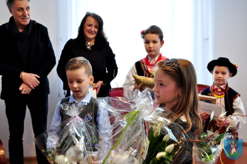 Pięknych życzeń od sądeckich uczniów, w tym rymowanych, które zaprezentowały dzieci z Pałacu Młodzieży, wysłuchał Prezydent Miasta Nowego Sącza Ludomir Handzel oraz jego zastępcy: wiceprezydent Artur Bochenek oraz wiceprezydent Magdalena Majka. Dzieci za każdym razem wręczyły prezydentom piękne świąteczne stroiki.