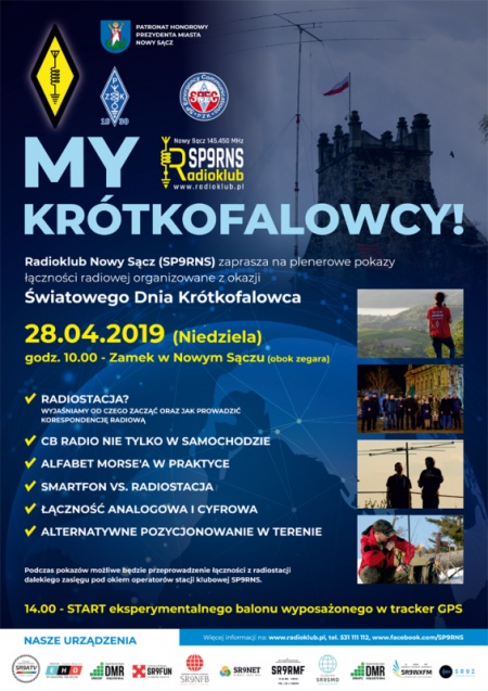 Radioklub Nowy Sącz (SP9RNS) zaprasza na plenerowe pokazy łączności radiowej, organizowane z okazji Światowego Dnia Krótkofalowca. Impreza, objęta Patronatem Honorowym Prezydenta Miasta Nowego Sącza Ludomira Handzla, odbędzie się w niedzielę, 28 kwietnia, o godz. 10.00 obok zegara w pobliżu nowosądeckiego zamku.