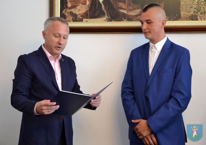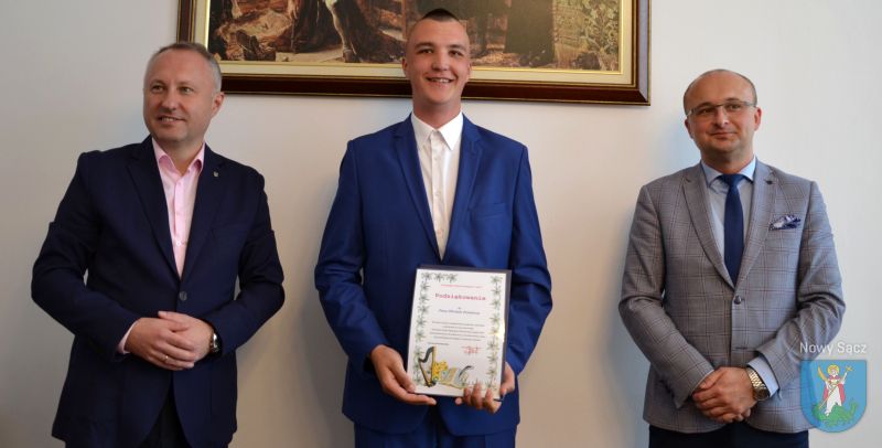 Michał Dziadosz – uczeń ostatniej klasy technikum w Zespole Szkół Samochodowych, odebrał z rąk Prezydenta Miasta Nowego Sącza Ludomira Handzla list gratulacyjny oraz podziękowanie za zaangażowanie w prace na rzecz drugiego człowieka. Michał jest wolontariuszem, biorącym udział w wielu akcjach charytatywnych.