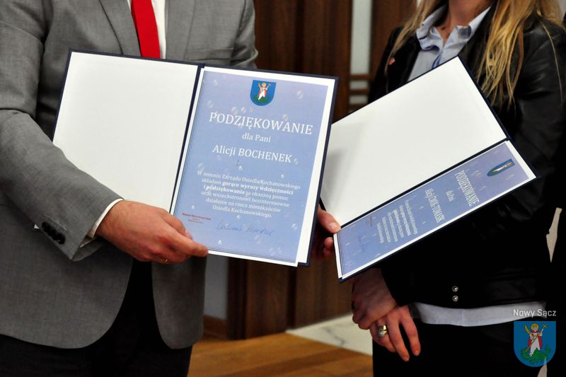 Dwie mieszkanki Osiedla Kochanowskiego: Alicja Bochenek oraz Alicja Ćwik - Tomasik otrzymały z rąk Prezydenta Miasta Nowego Sącza Ludomira Handzla podziękowania za okazaną pomoc oraz wszechstronne i bezinteresowne działanie na rzecz mieszkańców Osiedla Kochanowskiego. Taki miły akcent miał miejsce podczas spotkania prezydenta z liczną grupą mieszkańców w sali osiedlowej przy ulicy Kołłątaja.