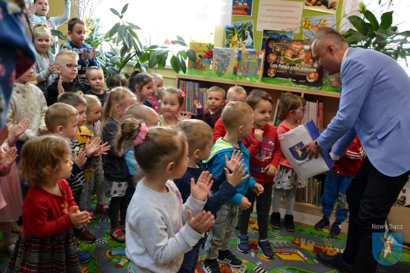 Po wysłuchaniu opowieści o słoniu Elmerze, dzieci zadawały pytania prezydentowi Nowego Sącza. Pytały między innymi o to, czy prezydent lubi czytać książki.