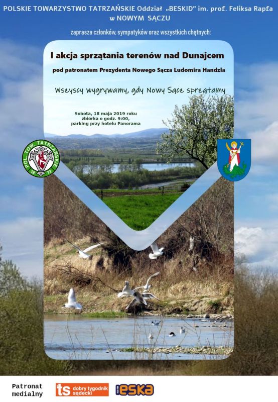 Polskie Towarzystwo Tatrzańskie oddział Beskid w Nowym Sączu zaprasza na I akcję sprzątania terenów nad Dunajcem pod hasłem "Wszyscy wygrywamy, gdy Nowy Sącz sprzątamy". Rozpoczęcie akcji w sobotę 18 maja o godzinie 9.00 przy parkingu obok hotelu Panorama. Patronat nad akcją objął Prezydent Miasta Nowego Sącza Ludomir Handzel, a wspiera ją spółka miejska NOVA.