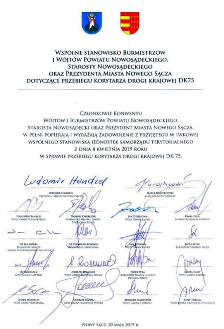 Wójtowie i Burmistrzowie Powiatu Nowosądeckiego, Starosta Nowosądecki oraz Prezydent Miasta Nowego Sącza podpisali dokument, odnoszący się do podpisanego w Iwkowej wspólnego stanowiska dotyczącego przebiegu korytarza drogi krajowej DK 75. Czytamy w nim, że podpisujący "w pełni popierają i wyrażają zadowolenie z przyjętego w Iwkowej wspólnego stanowiska jednostek samorządu terytorialnego z dnia 4 kwietnia 2019 roku w sprawie przebiegu korytarza drogi krajowej DK 75".