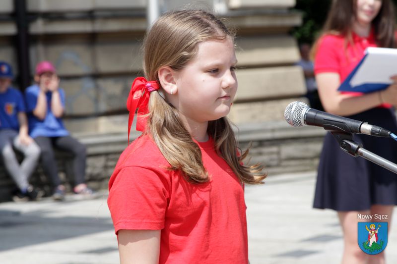 Szkołę powitała wiceprezydent Nowego Sącza, Magdalena Majka. – Kochani, bardzo serdecznie was witam na rynku przed naszym pięknym ratuszem. To naprawdę coś pięknego: za waszymi plecami widzimy dwie wieże bazyliki, której patronką jest św. Małgorzata, a dzisiaj naprzeciwko tych dwóch wież stoi św. Jadwiga Królowa. Mamy takie wspaniałe patronki: bazyliki i waszej szkoły. To coś pięknego, że czujecie się częścią tej szkoły, że wiecie, kto jest jej patronką i jak ona jest ważna; jakie cechy i jakie wartości was obowiązują, właśnie dlatego, że jesteście uczniami tej szkoły – SP 2, która dzisiaj święto ma – zakończyła pani wiceprezydent.