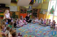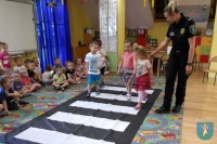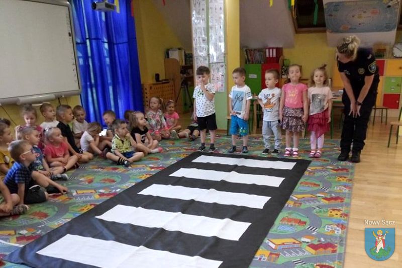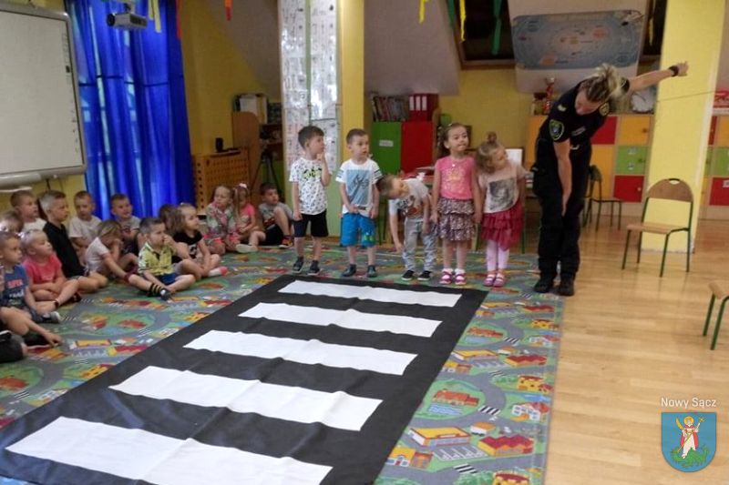 Funkcjonariusze Komendy Straży Miejskiej w Nowym Sączu przeprowadzili zajęcia dotyczące bezpieczeństwa. Wszystkie dzieci ćwiczyły przejście przez jezdnię i dyskutowały na temat poruszania się po drodze, kiedy nie ma chodnika. Przeszkolona funkcjonariuszka straży miejskiej przypominała o znakach drogowych, które mogą pomóc pieszym w bezpiecznym poruszaniu się.