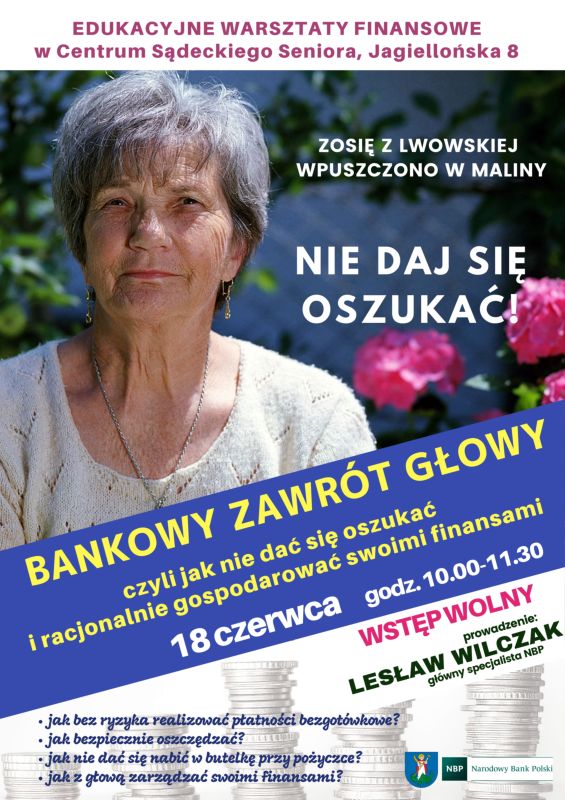 Urząd Miasta Nowego Sącza wraz z Narodowym Bankiem Polskim zapraszają na edukacyjne warsztaty finansowe, które odbędą się 18 czerwca (wtorek) w Centrum Sądeckiego Seniora przy ul. Jagiellońskiej 8 w Nowym Sączu, w godz. od 10.00 do 11.30. Wstęp wolny.
