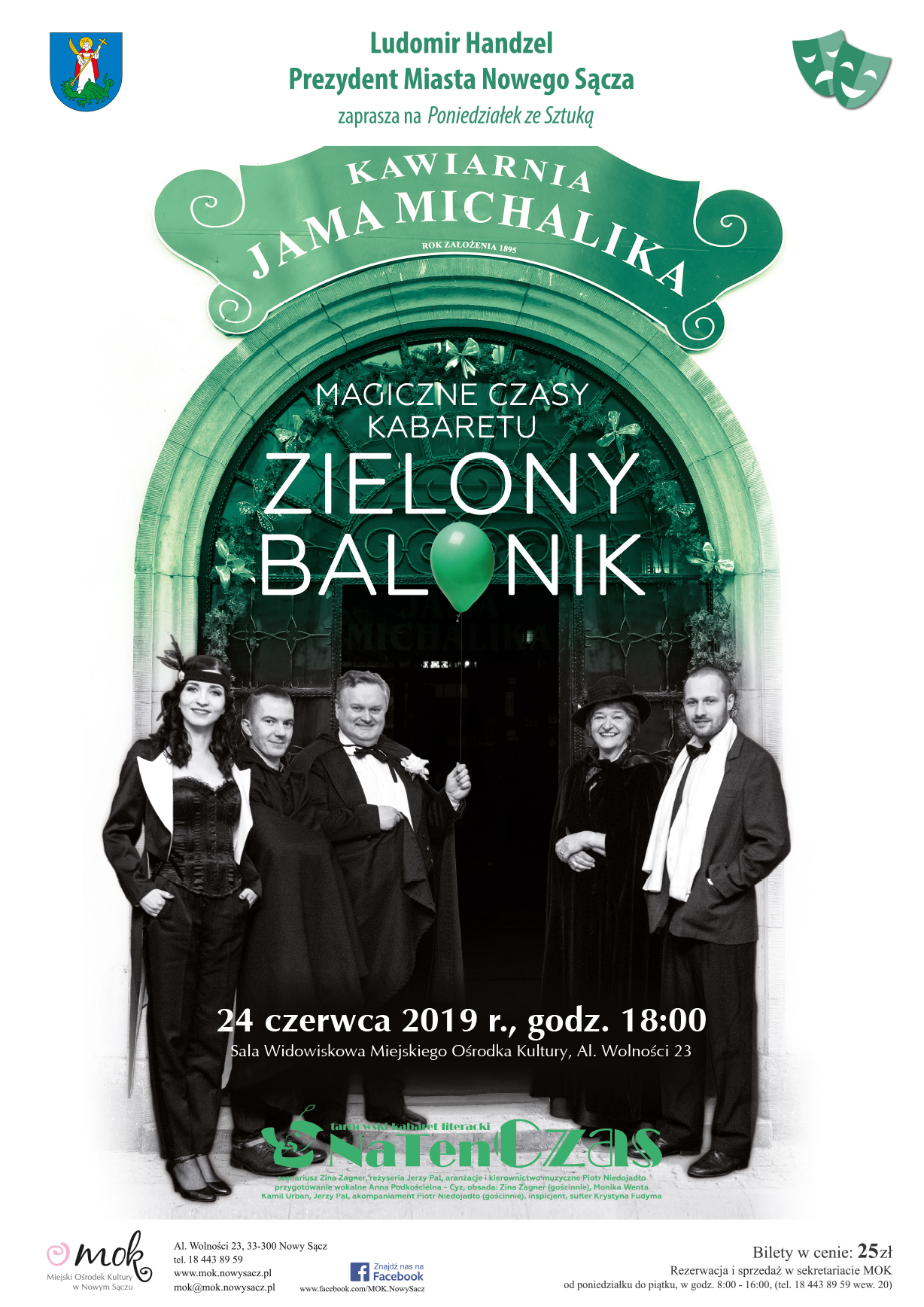 Prezydent Miasta Nowego Sącza Ludomir Handzel zaprasza na kolejne spotkanie z cyklu Poniedziałek ze Sztuką. Tym razem na scenie Miejskiego Ośrodka Kultury wystąpi Tarnowski Kabaret Literacki NaTenCzas, który przeniesie widzów w magiczne czasy Kabaretu „Zielony Balonik”. Spektakl odbędzie się 24 czerwca o godzinie 18:00 w MOK przy Al. Wolności 23.