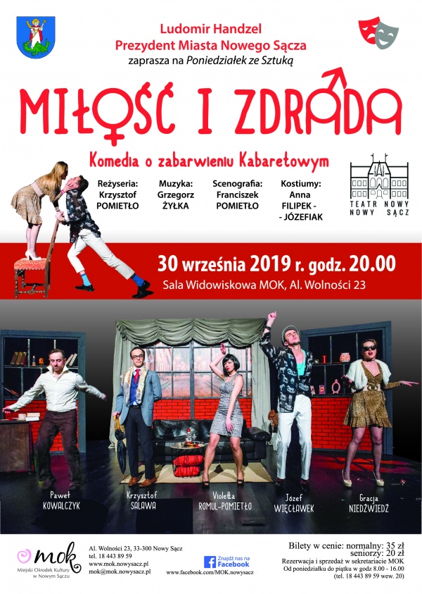 Prezydent Nowego Sącza Ludomir Handzel zaprasza 30 września do Miejskiego Ośrodka Kultury na kolejny Poniedziałek ze Sztuką. Tym razem na deskach MOK-u zobaczymy spektakl MIŁOŚĆ I ZDRADA – komedię o zabarwieniu kabaretowym w wykonaniu Teatru Nowego z Nowego Sącza.